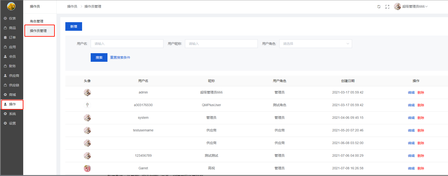 新增管理,设置用户名密码用户登录,选择角色设置权限