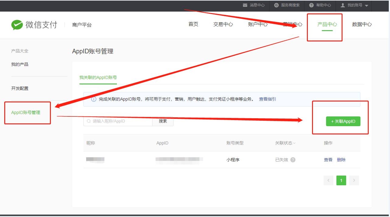 (关联小程序也是一样的步骤,进入小程序后台-开发管理-开发设置获取APPID-复制到商户号关联-到小程序后台微信支付确认关联即可)