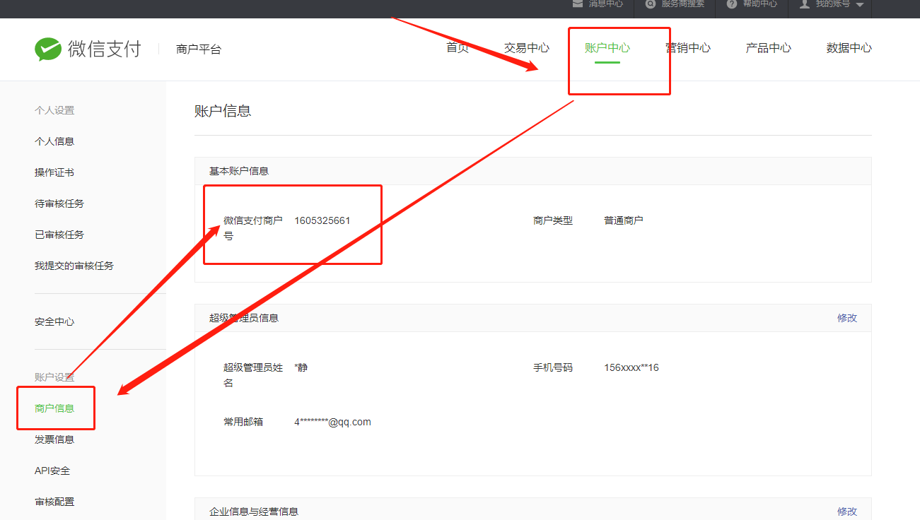 第四步:获取微信支付商户号-支付密钥-证书1,微信支付商户号,账户中心-商户信息-微信支付商户号
