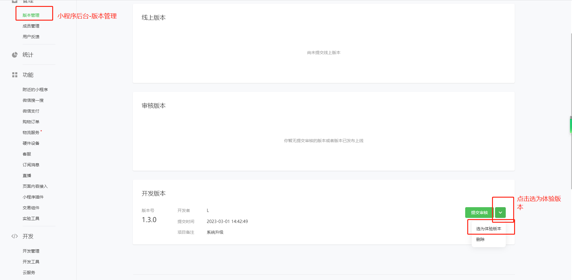 7、小程序后台-版本管理-提交刚发布的开发版本为体验版