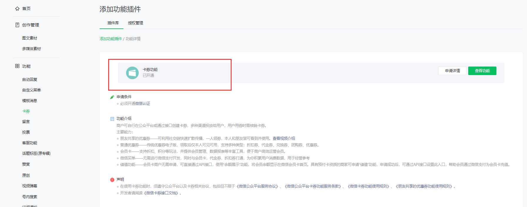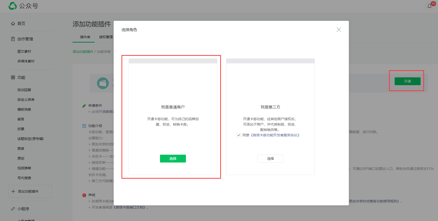 2、登录公众号平台mp.weixin.qq.com,【功能】-【添加功能插件】-【卡券功能】,开启卡券功能,选择“我是普通商户”