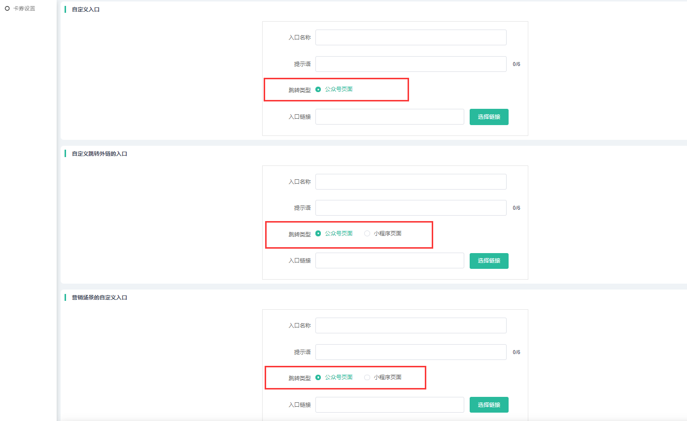 15、自定义跳转外链的入口、营销场景的自定义入口与自定义入口操作相同,且可选择商城小程序链接。