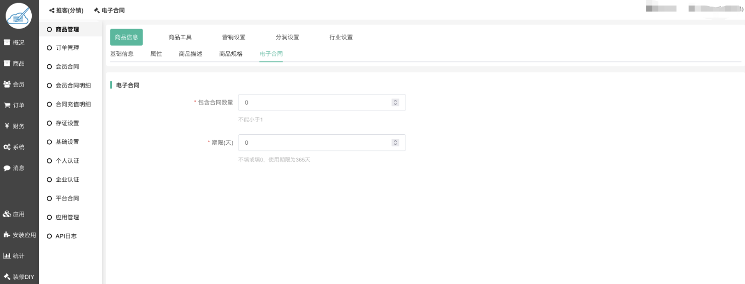 注意:如果您只是自用,不需要销售电子合同套餐,可以不用发布电子合同商品,只要在会员合同中给企业法人会员直接手动充值合同即可。