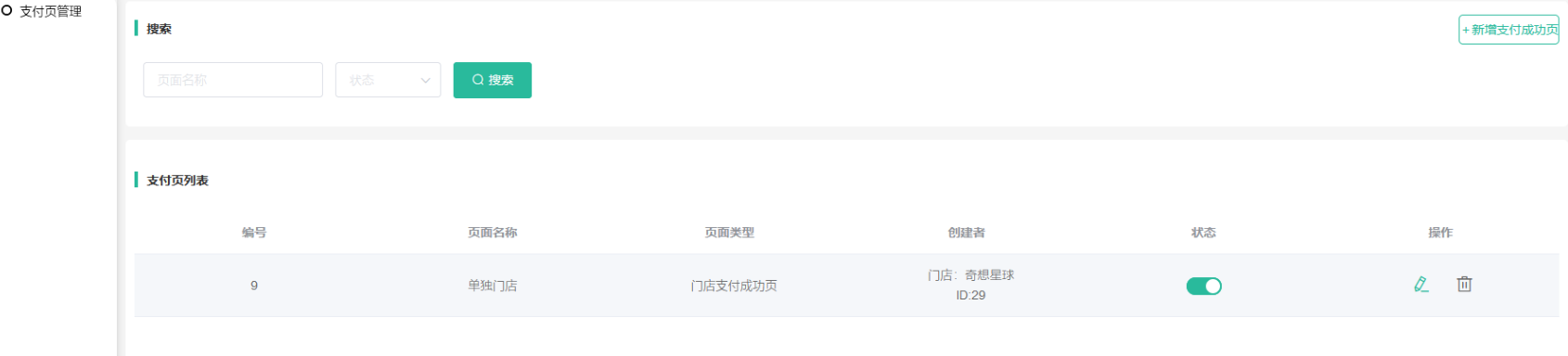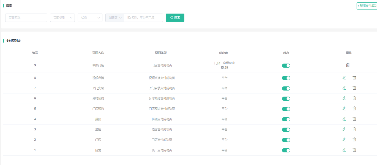 2,支付页管理:显示所有支付成功页面,包括门店独立后台和酒店独立后台添加的支付页面