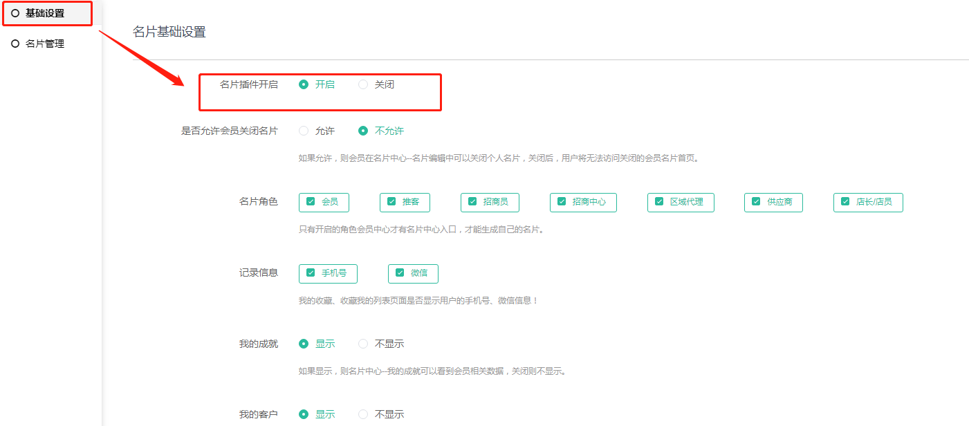 1,开启名片插件:只有开启名片插件会员中心才会显示,关闭则不显示